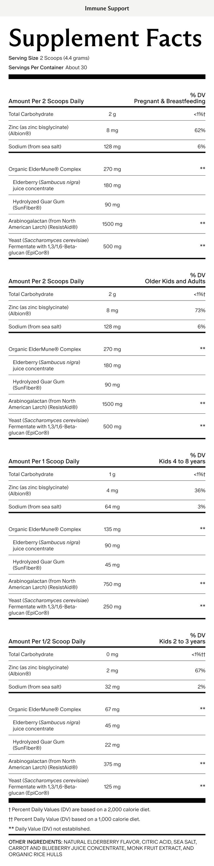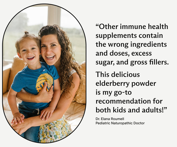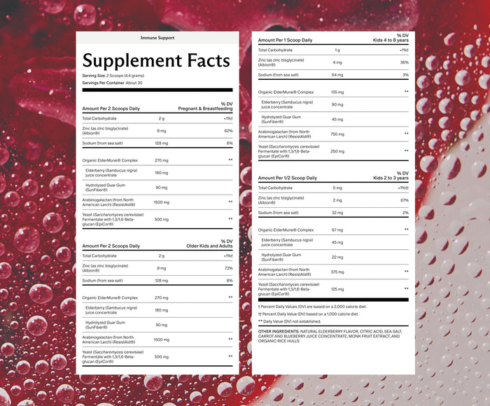 Daily immune support for the whole family*. Easy-to-take and delicious elderberry, zinc, pre and postbiotic powder.