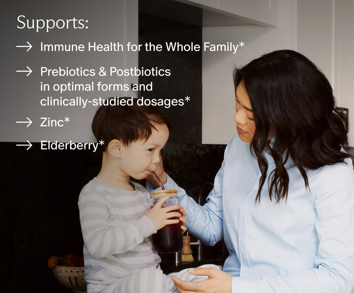Our pregnancy-safe, kid-friendly powder with elderberry includes zinc and clinically studied pre/postbiotics for immune support.*