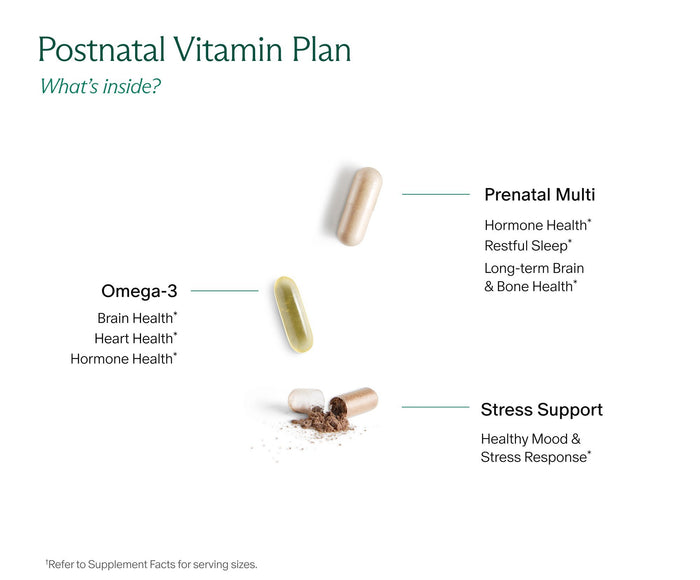 Omega-3 (DHA+EPA): Omega-3s are essential nutrients for recovery from birth and support nutrient dense breastmilk.