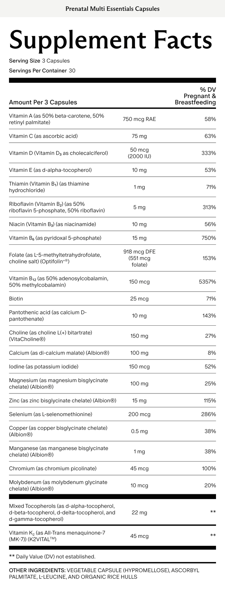 Our Prenatal Multi Essentials (3 capsules per day) includes 23 key nutrients at supportive dosages your body needs for comprehensive nourishment. The Prenatal Multi Essentials dosing is far more comprehensive than a one-a-day prenatal, but lower than the optimal dosing in our Prenatal Multi Powder or Capsules (8 capsules per day).