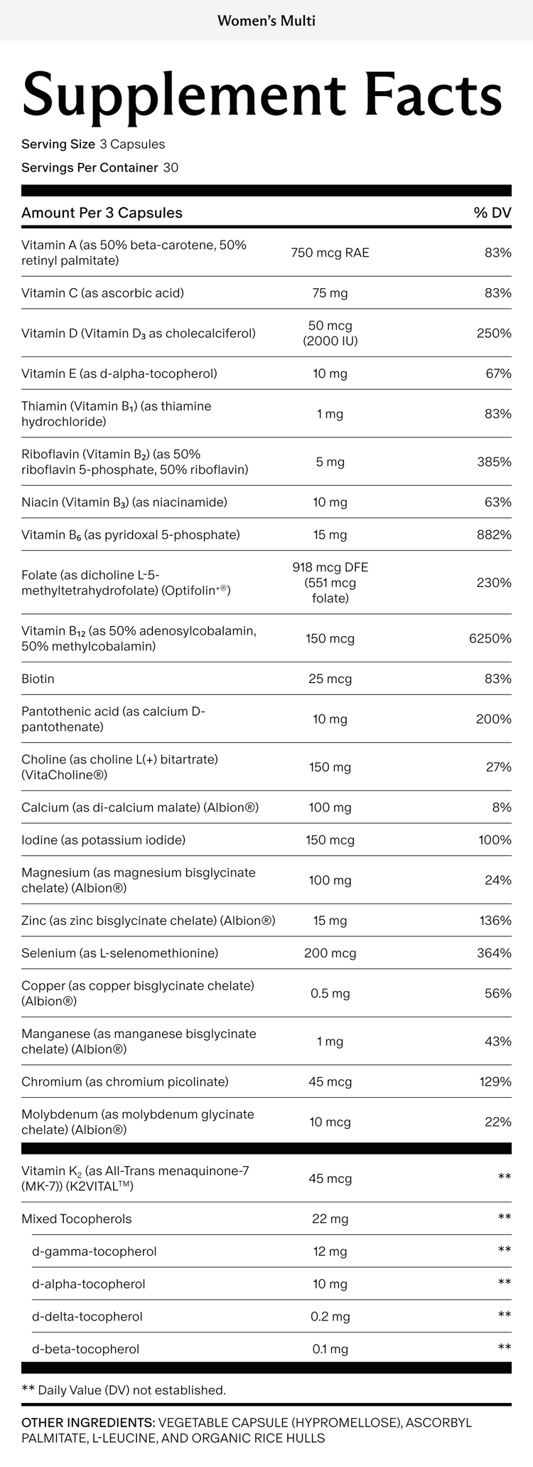 As a dietitian, I strive to help my clients achieve optimal nutrition through food. Even with the most thoughtfully planned diet, it's nearly impossible to meet daily requirements through food alone. I recommend that women complement their diet with a wide range of bioavailable forms of nutrients like those found in Needed's Women's Health Multi. The quality of Needed's supplements is unmatched.