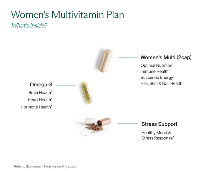 These three essential products — our Women’s Multi, Women’s Omega-3+ and Stress Support— are designed to help you thrive with targeted nutrient and herbal support*. Together, these products support healthy hormone balance, metabolic health, focus and mood, a healthy immune response, as well as your energy, beauty, and overall vitality*.