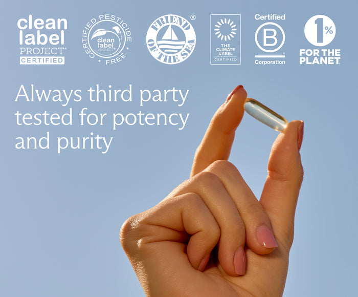 Omega-3: Our Omega-3 goes beyond bare minimum dosages and delivers a high potency dose of 1000mg DHA and 1000mg EPA (per 4 gel caps) for optimal support. Our sustainably-sourced fish oil is encased in a gelatin-free, plant-based shell designed specifically to avoid unpleasant taste, smell, and fish burps. Our Omega-3 is shelf stable and does not require refrigeration. Our Omega-3 is Friend of the Sea Certified, and has been certified a Clean Label Project Purity and Pesticide Free Award.